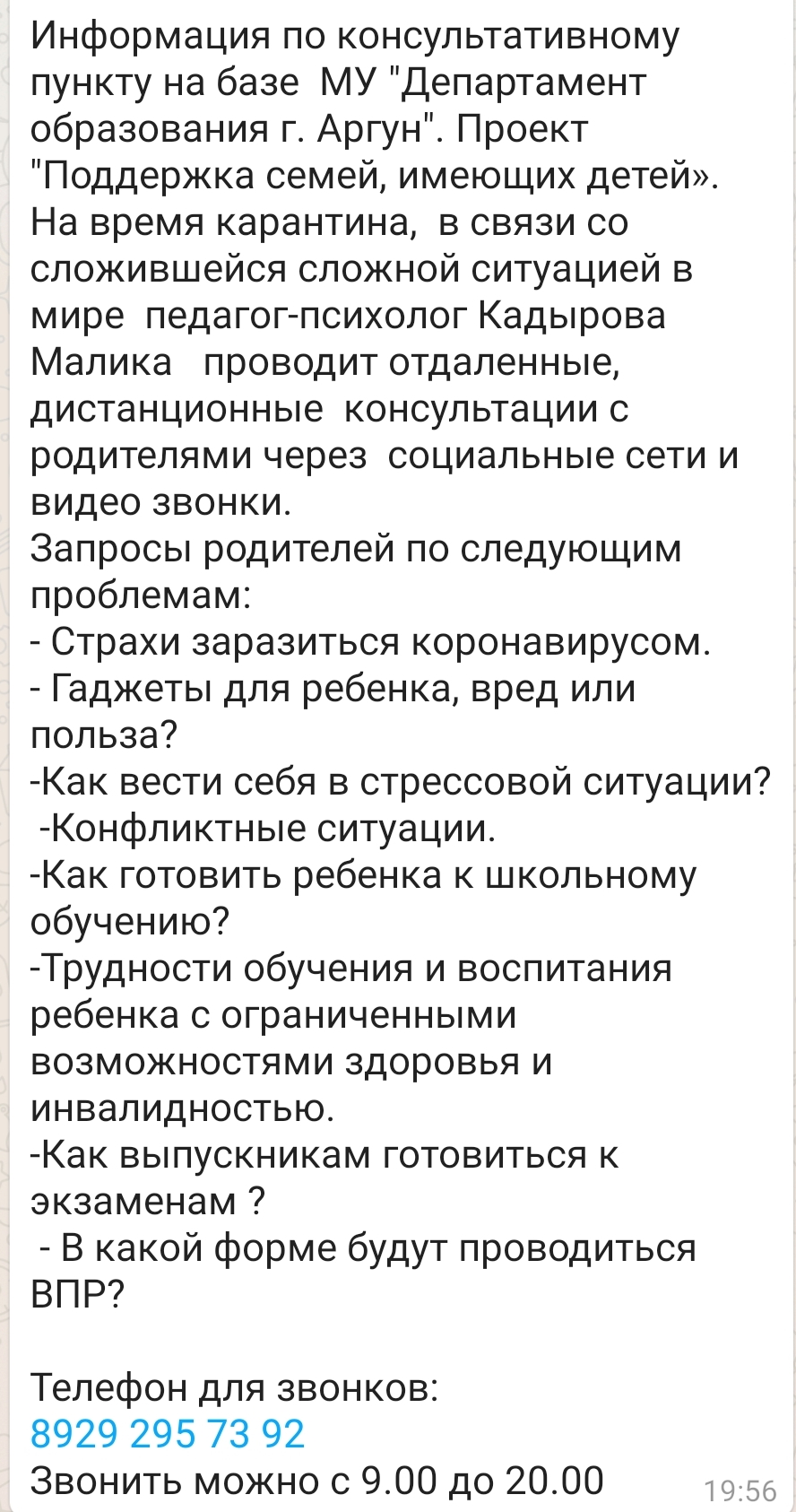 Информация по консультативному пункту на базе МУ "Департамент образования г. Аргун"