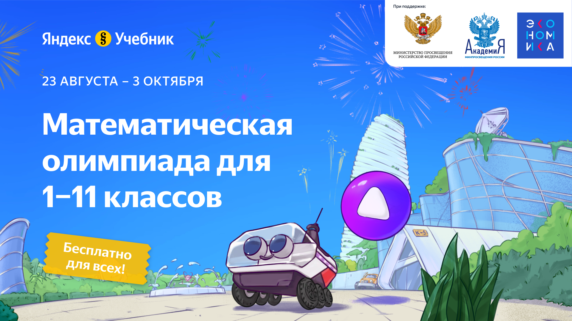22.08.2022Технологическая образовательная платформа Яндекс Учебник приглашает учеников 1-11-х классов принять участие в Математической олимпиаде. Она пройдёт с 23 августа по 3 октября.