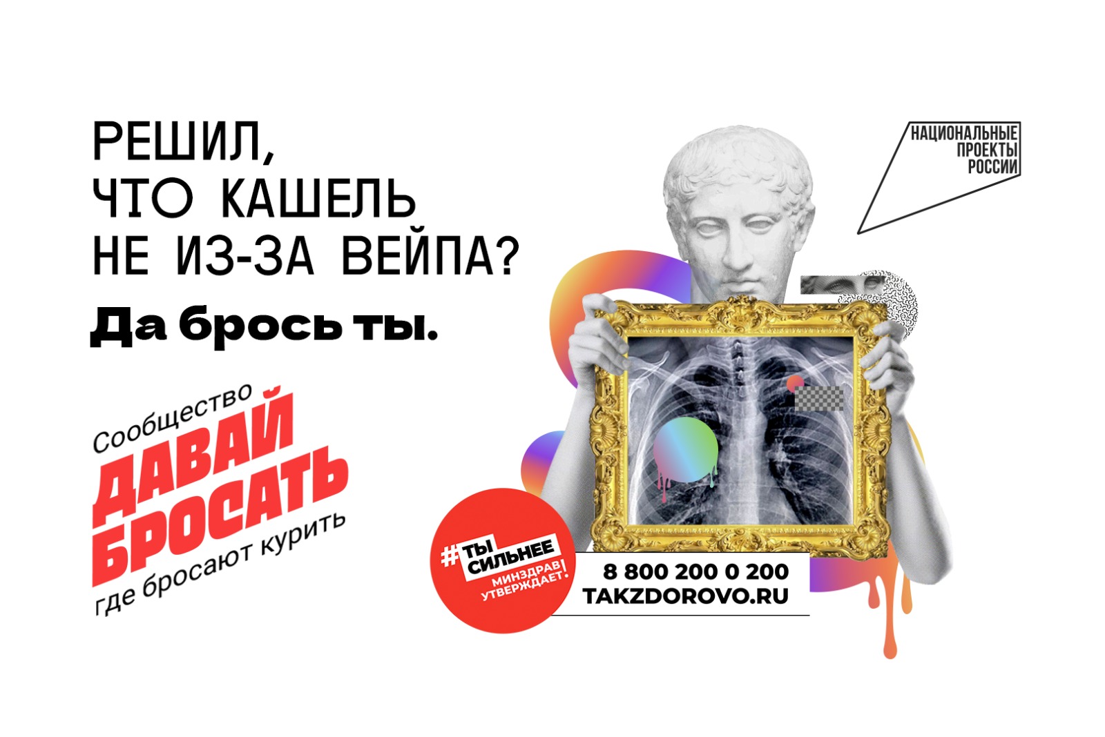 1 мая по нацпроекту «Демография» АНО «Национальные приоритеты» совместно с Минздравом России запустило коммуникационную кампанию «Электронные сигареты и что они скрывают». Рекламные баннеры побуждают людей задуматься, так ли безопасны электронные сигареты для здоровья и какие последствия для организма может спровоцировать курение. Решил, что кашель не из-за вейпа? Считаешь, что курение электронных сигарет не вредно и это просто «клубничный пар»? Да брось ты.