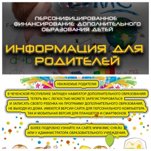 05.09.2018Уважаемые родители, информируем вас, что в 2018–2019 учебном году в Чеченской Республике внедряется система персонифицированного финансирования дополнительного образования детей. Региональный навигатор дополнительного образования детей (http://rmc-chr.ru) работает на всей территории Республики, Родители могут заходит по ссылке на сайт и регистрировать своих детей на интересующие их кружки дополнительного образования своей школы